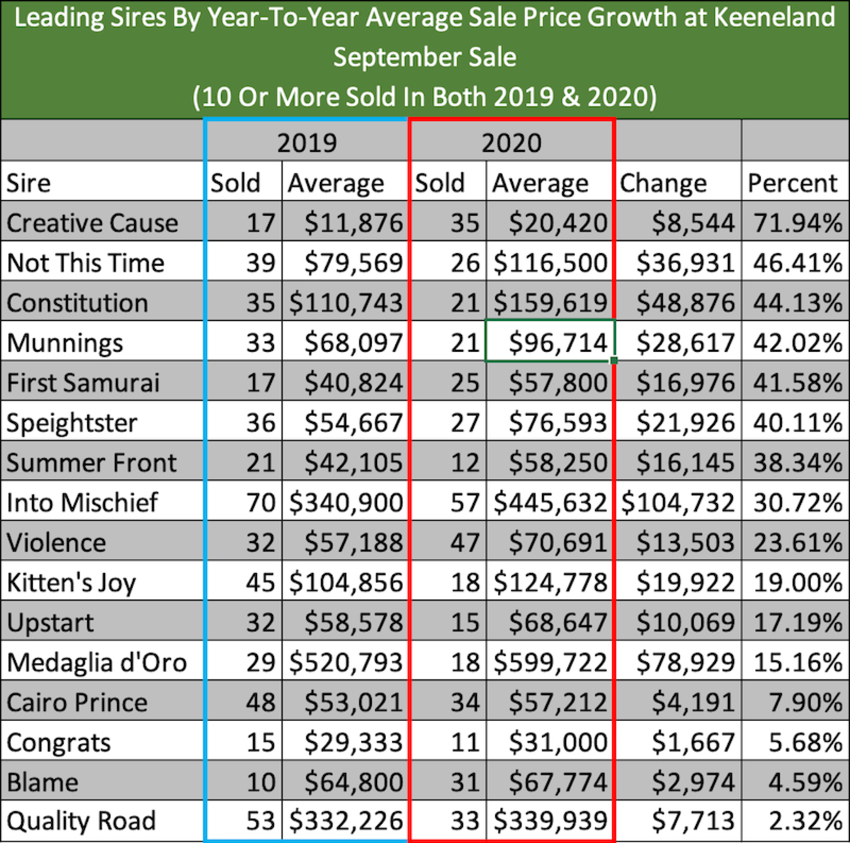 Leading the charge was Airdrie Stud's Creative Cause, whose average jumped 71.94 percent during this year's Keeneland September sale to $20,420 from 35 horses sold. As the broadest yearling auction in North America, both by duration and the scope of offerings, a big swing in performance at the Keeneland September sale can be a strong indicator of public favor toward a particular stallion.