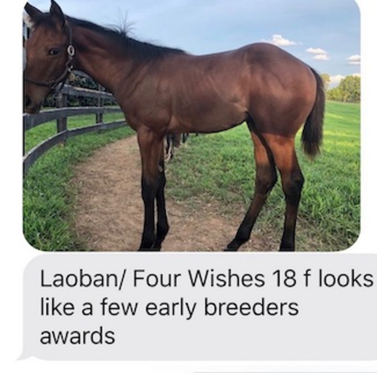 Four Wishes and her colt came home to Kentucky in the summer, and the following April her Laoban filly was born in the New York.