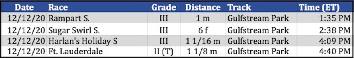 The Harlan's Holiday and Fort Lauderdale are preps for the $3 million Pegasus World Cup Invitational (G1) and the $1 million Pegasus World Cup Turf Invitational (G1), respectively, Jan. 29 at Gulfstream. The Suwannee River is a prep for the $1 million Pegasus World Cup Filly & Mare Turf (G3) on the same program.